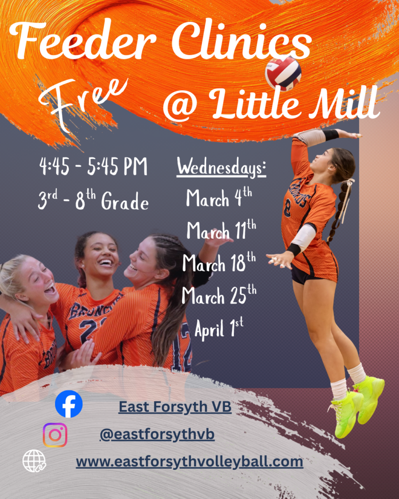 In the month of March, the East Forsyth Feeder Program will be putting on free clinics at Little Mill. This is a great opportunity for players of all skill levels to get into the gym and work on their volleyball skills. The clinics will focus on skill development, with an emphasis on the keys related to passing, serving, hitting, defense, and much more.